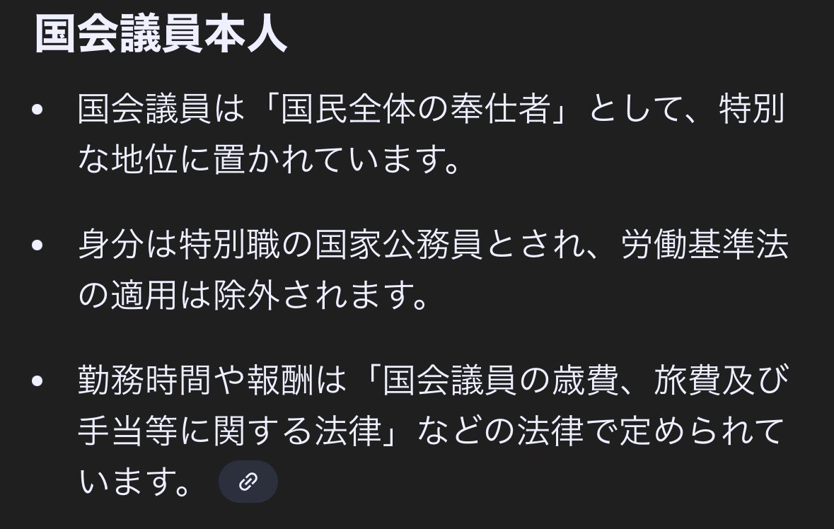 ERIKSON🇯🇵🇵🇭 (@ERIKSON210) on X高市さんの「ライフワークバランス」発言を切り取って叩いてる朝日新聞さんに毎日新聞さんそもそも「国会議員は労働基準法の対象...国会議員は、国民全体の代表として、その職務を遂行する責任を負っています。労働基準法は、労働者の権利を保護するための法律ですが、国会議員には適用されません。なぜなら、国会議員は、時間や場所に縛られず、国民の負託に応えるために、必要に応じて職務を遂行する必要があるからです。